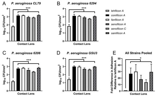 To determine if the trends in adhesion density seen for ATCC 10145 generalize to other strains, we performed quantitative adhesion assays for four additional clinically relevant P. aeruginosa strains (Figure 3). For P. aeruginosa strain CL79 (Figure 3A), lehfilcon A bound less (1.8 ± 0.1 log CFU/mm2; p < 0.0005 for all comparisons) than did comfilcon A (3.1 ± 0.1 log CFU/mm2), fanfilcon A (3.2 ± 0.0 log CFU/mm2), senofilcon A (2.9 ± 0.1 log CFU/mm2), senofilcon C (2.9 ± 0.0 log CFU/mm2), or samfilcon A (3.2 ± 0.1 log CFU/mm2).