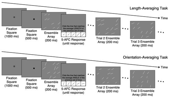 The participants were randomly assigned to one version of the study that contained both the length- and orientation-averaging tasks. The length-averaging task preceded the orientation-averaging task in all versions to avoid introducing another source of variability. For each trial in both tasks, the participants judged the average length or orientation of the lines in an ensemble (Figure 1). To prevent the participants from processing each line individually, the presentation time for each ensemble was 200 ms. A fixation square sequence lasting 1500 ms (i.e., a 1000 ms open square and 500 ms black square) preceded each ensemble. The participants were then prompted to estimate the average length or orientation of the ensemble by clicking on one of the 5 buttons, each depicting a line having a specific length or orientation. There was no time limit to make the average length/average orientation judgments. The participants completed 10 practice trials with non-guided feedback (i.e., the feedback told the participants whether they were correct or incorrect but did not indicate the correct answer). The practice trials allowed participants to familiarize themselves with the procedure and provided guidance on how to compute the average length or orientation of an ensemble. In the practice trials, the mean length or orientation of the ensembles was one of the 5 values used in the main tasks, but the SD was 4 pixels or 4.5°. Additionally, the lines in each practice ensemble were only placed in columns 1, 3, and 5 in the grid. This resulted in ensembles with lines that were easier to average compared to the main task ensembles. Each participant in all versions completed 120 trials of the length-averaging task followed by 120 trials of the orientation-averaging task.