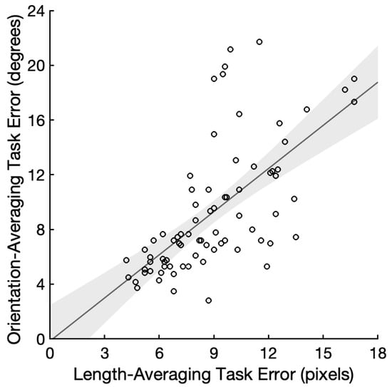 Scatterplot demonstrating the relationship between length-averaging errors and orientation-averaging errors, with each data point representing a unique participant. The linear best fit is shown (95% CI).