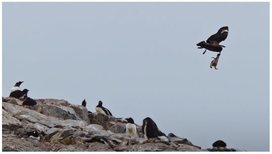 All penguins breed and raise their chicks on land but forage underwater. On land, they are hunted by natural predators, such as the brown skua Stercorarius antarcticus (Figure 1) and, increasingly, by introduced predators such as ferrets, stoats, and feral cats—particularly those penguins living in temperate and tropical latitudes [,]. They also forage underwater to take evasive prey. In modern times, entanglement by fishing nets at sea is also a major concern []. Thus, vision is likely important for penguins in both environments. However, because penguins hunt solely underwater, their eyes do not have to cope with the sudden transition in refractive index that birds such as shags Leucocarbo spp. do when they circle in the air before diving underwater to spear their prey.