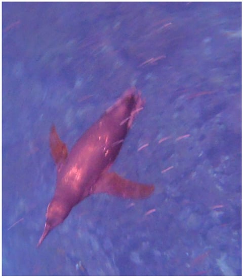 The depths that other penguins dive to fall somewhere between these two extremes, with most either only diving to shallow depths at night or not at all. King penguins in South Georgia (54°26′ S) have recorded dive depths of up to 304 m during the day, but to no more than 100 m at night []. Deeper dives at night may be unnecessary due to the diel migration of many penguin prey species []. The slightly smaller gentoo Pygoscelis papua and macaroni Eudyptes chrysolophus penguins have also been recorded foraging both day and night in South Georgia, but again only to shallow depths (20 m) in the dark—which corresponds to the diel migration of krill Euphasia superba, a primary prey species of the studied colony []. Magellanic penguins Spheniscus magellanicus have been observed diving up to 95 m at 54°38’ S, although most dives were between 5 and 15 m []. The benthic feeding yellow-eyed penguin has been recorded foraging at a median depth of 54.4 m during the day in waters at 45.9° S which, on the video, are clearly bright enough for vision []. Another study found that the foraging trips of yellow-eyed penguins Megadyptes antipodes were longer and deeper during the day than early evening (25 m vs. 16 m), with the birds returning to land at night []. The Galápagos penguin Spheniscus mendiculus, the only penguin to live and breed entirely in tropical climates, dives up to 27 m deep (Figure 2). They also are typically diurnal foragers [].