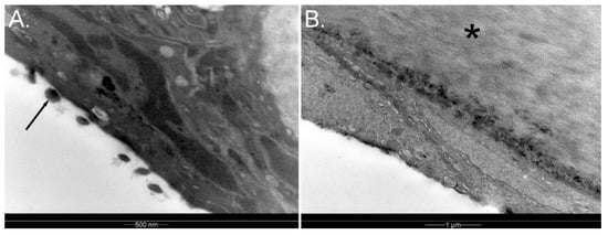Transmission electron micrograph of Membrana nictitans of a gentoo penguin Pygoscelis papua; (A) Note the excrescences on the posterior surface (arrow); (B) There is a regular, parallel arrangement of collagen fibrils in the stroma (asterix). Credit: PWH.
