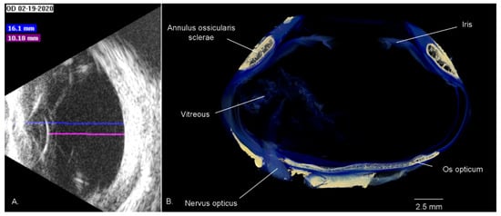Bulbus oculi (the eye) of selected penguins. (A) B-scan ultrasound, little penguin Eudyptula minor eye (Scanmate, DGH Technology Inc., Exton, PA, USA). In this eye, the axial length (blue) measures 16.1 mm and the distance from lens to retina (pink) is 10.18 mm. Credit: PWH; (B) Micro-CT of king penguin Aptenodytes patagonicus eye—note the aspheric shape of the eye and the bony elements within (beige). Reconstructed from publicly available raw data at https://figshare.com/articles/dataset/Hadden_King_penguin_micro_CT_stained_eye/12924741 (accessed on 23 August 2022) (Digital Science, London, UK) using CT Vox 3.3 (Bruker MicroCT, Kontich, Belgium) software.