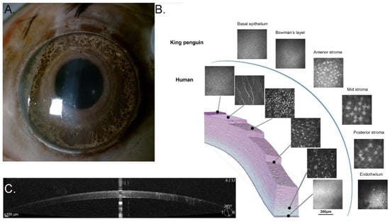 Cornea of the king penguin Aptenodytes patagonicus. (A) Immediate post-mortem slit lamp photograph; note the transparent appearance and the translucent Membrana nictitans covering the cornea on the left-hand side (Credit: PWH); (B) Confocal micrographs of the king penguin cornea compared to those of the human (Heidelberg Retina Tomograph II Rostock Corneal Module, Heidelberg Engineering GmBH, Germany), which conforms to the description by Kafarnik et al. of other avian corneas. Note the absence of a subepithelial nerve plexus in Bowman’s layer; (C) Anterior segment optical coherence tomogram of the cornea (REVO NX, OPTOPOL Technology Sp. Z o.o., Zawierce, Poland). Credit: PWH.