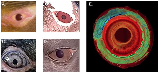 - De Carvalho, C.M.; Rodarte-Almeida, A.C.d.V.; Santana, M.I.S.; Galera, P.D. Avian ophthalmic peculiarities. Ciência Rural 2018, 48, e20170904. [Google Scholar] [CrossRef]