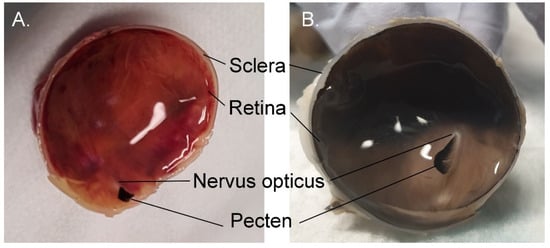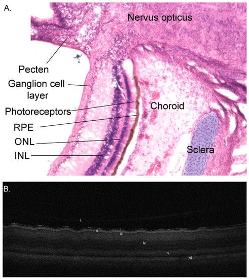 The diapsid ancestor had a network of epiretinal vessels to nourish the inner retina, which developed into the pecten in birds (Figure 8 and Figure 10). The pecten is a very vascular extension of the central retinal artery into the vitreous cavity, which provides inner retinal nutrition. The small molecules and oxygen that the inner retina requires tend to pool in the inferior vitreous near the pecten but disperses with rapid eye movements (saccades) []. Unlike mammals, birds lack intrinsic retinal vasculature. Birds also generally have a relatively thicker choroid than mammals, which nourishes the outer retina. An avascular retina may allow better vision due to less obstruction to light as it passes through the retina on its way to the photoreceptors [] (p. 197).