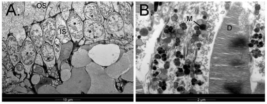 Retina of the king penguin Aptenodytes patagonicus, as imaged with transmission electron microscopy. (A) Both outer segments (OS) and inner segments (IS) of the retinal photoreceptors are approximately 6–7 mm apart; (B) The photoreceptor outer segments, which contain discs (D) wherein phototransduction takes place, are surrounded by melanosome-laden retinal pigment epithelial cells (M). Credit: PWH.