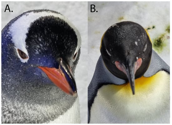 Penguins (Spheniscidae), being birds, are members of the only extant dinosaur clade and, as such, have inherited a highly evolved visual system, in many respects ‘better’ than that of mammals and one which has likely been integral to their ability to colonise some of Earth’s most extreme environments []. Vision is likely a key driver of penguin behaviour [] (p. 27). Of note, penguins have a relatively small olfactory bulb compared to many other birds [] and loss of sight due to dense cataracts has been noted to cause significant behavioural changes, such as being easily startled [,]. Although all are flightless, they are a diverse and numerous clade with a wide latitudinal spread and a diverse behavioural repertoire. Given this, their charismatic nature, and their economic significance—particularly for tourism—the penguin visual system has long been a subject of interest.