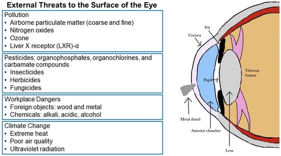 - Lin, C.C.; Chiu, C.C.; Lee, P.Y.; Chen, K.J.; He, C.X.; Hsu, S.K.; Cheng, K.C. The adverse effects of air pollution on the eye: A review. Int. J. Environ. Res. Public Health 2022, 19, 1186. [Google Scholar] [CrossRef] [PubMed]