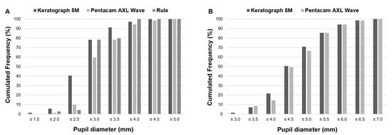 Cumulative percentage of eyes achieving a particular pupil diameter with each device in (A) photopic or (B) mesopic pupil diameter.