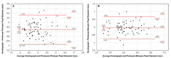 Agreement between Keratograph and Pentacam AXL Wave in the measurement of the (A) photopic and (B) mesopic pupil diameter. Exact 95% confidence intervals are shown above and below the mean difference and limits of agreement.