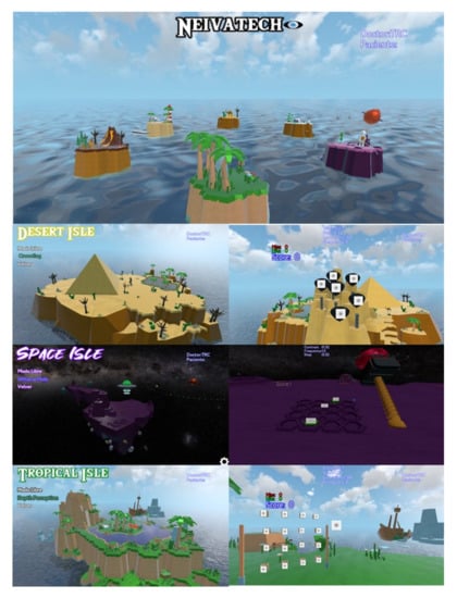A visual training program based on perceptual learning based on the use of Gabor patches stimulus and specifically designed for a virtual reality environment was used (NEIVATECH, Grupalia Internet SA, Madrid, Spain). The software consists of six thematic islands, with six mini-games on each island in which the subjects develop different tasks. Three of these mini-games were selected for training purposes in the current pilot study: “Crowding” in the Desert Isle, “Whack a Mole” in the Space Isle, and “Depth Perception” in the Tropical Isle (Figure 1). In all mini-games, the Gabor patches stimuli were used during the task. In the first mini-game, the task was to detect the balloons with the target stimulus (a specific Gabor patch) and shoot them from a distance with a laser pointer. In the second mini-game, the task was to punch those Martians emerging in a few seconds from small caves on the floor, using the control, showing a stimulus similar to a specific target (a specific Gabor patch), which required the movement of the subject over the space from a near to intermediate distance. In the third mini-game, the task was to explode wood boxes containing a target stimulus. In contrast to the game with balloons, the task was to explode the boxes guided by stereoscopic cues, i.e., shooting from the closest boxes to the farthest ones.