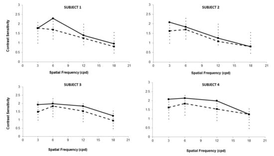 Contrast sensitivity of the amblyopic eye at baseline (discontinuous line) and final visit (continuous line) for 3, 6, 12, and 18 cpd (SUBJECT 1–4) obtained with the CSV1000 test. Small dots represent the possible values reportable depending on the spatial frequency evaluated, that is, the possible steps in the response of this test.