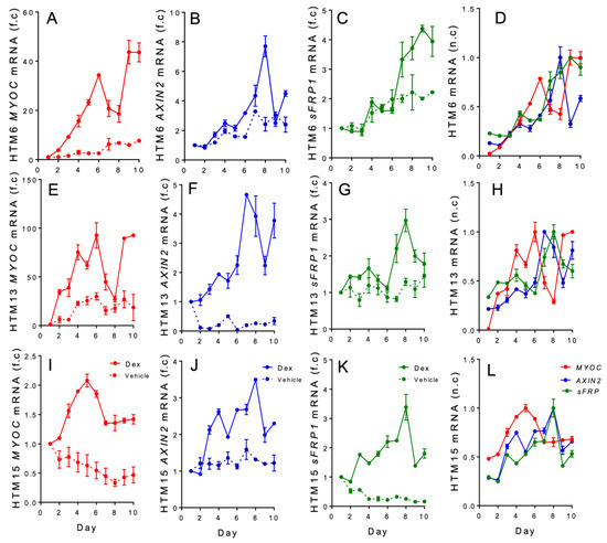 To determine the expression levels of the MYOC, AXIN2, and sFRP1 genes, RT-qPCR was carried out over a 10-day treatment period in DEX-treated HTM cells. Our results demonstrate that MYOC, AXIN2, and sFRP1 gene expression occurred in chronologic order (Figure 1A–L). MYOC expression peaked first (day 8 in HTM6 cells, day 6 in HTM13 cells, and day 5 in HTM15 cells), followed by AXIN2 peak expression, which occurred on day 8 for HTM6 cells, day 7 for HTM13 cells, and day 8 for HTM15 cells. Furthermore, sFRP1 expression levels peaked after MYOC and AXIN2 (day 9 for HTM6 cells and day 8 for HTM13 and HTM15 cells). Moreover, for all three HTM cell cultures, when sFRP1 expression levels increased, AXIN2 levels declined around days 8–9, and MYOC levels peaked once again around days 9–10. These findings regarding MYOC expression are consistent with those of previous studies that showed that DEX induces the upregulation of MYOC mRNA in a time-dependent manner [58,59].