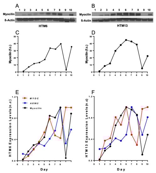 Myocilin protein expression of DEX-treated HTM cells over 10-day time course. Western blot analysis showed the 10-day study of DEX-induced myocilin protein levels for cell batches HTM6 and HTM13. HTM cells were treated with DEX (100 nM) for 10 days. Each day, two flasks were randomly selected and harvested to isolate cytoplasmic fractions. These cytoplasmic fractions were analyzed by Western blot with antibodies against myocilin and β-actin. Β-actin was used as a control and for normalization. Images of the gels are presented in (A,B). The background contrast was adjusted, and blots were quantified for fold change (f.c.) using the ImageJ software. Western blot analysis showed that myocilin protein levels began increasing on day 2, and a similar observation was made for both batches. Myocilin protein levels first peaked on day 6 for HTM6 and for HTM13 (C,D). Myocilin protein levels dropped on day 9 for both DEX-treated HTM cell batches (C,D). Overlay of quantitative qPCR and Western blot analysis, as shown by normalized change (n.c.), indicates that there was a correlation between AXIN2 and myocilin expression. Overlay of DEX-induced MYOC and AXIN2 gene expression and myocilin protein expression of HTM6 and HTM13 over 10-day time course (E,F). Over 10 days, AXIN2 and MYOC expression was enhanced; however, there was an increase in MYOC expression on day 8 and day 9 and a sharp decline of AXIN2 gene expression and myocilin protein expression on day 9.