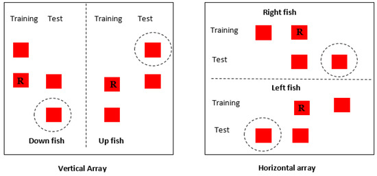 Fish were placed into two experimental groups, either ‘down-right’ or ‘up-left’. Fish in the down-right condition were trained to go to the bottom landmark in the vertical array and the right-hand landmark in the horizontal array (both of these landmarks were actually in the middle of the baseplate, however, see Figure 2 for clarification). Fish in the up-left condition were trained to visit the top landmark in the vertical array and the left-hand landmark in the horizontal array. Testing in both directions helped to control for height preference as some fish were rewarded by visiting the highest landmark, while others were trained to select the lower landmark. Apart from this difference, training in the two groups was identical.