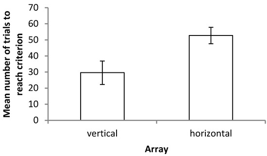 Mean number of trials required to reach the criterion (9 out of 10 correct choices) in the horizontal and vertical arrays. Error bars denote the standard error of the mean. See Figure S2 for a scatter plot showing this data.