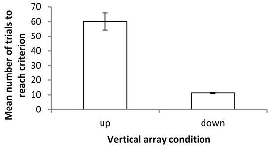 Mean number of trials required to reach the criterion (9 out of 10 correct choices) on the vertical array task for fish in ‘up’ and ‘down’ conditions. Error bars denote the standard error of the mean.