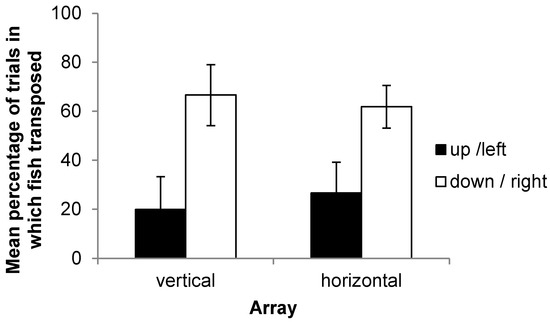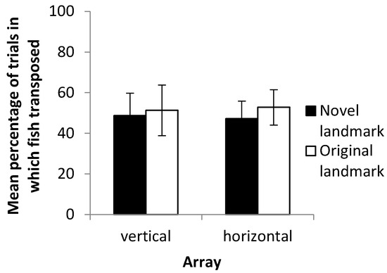 Mean percentage of trials in which fish transposed (selected the novel landmark) shown for the horizontal and vertical arrays. Error bars indicate the standard error of the mean.