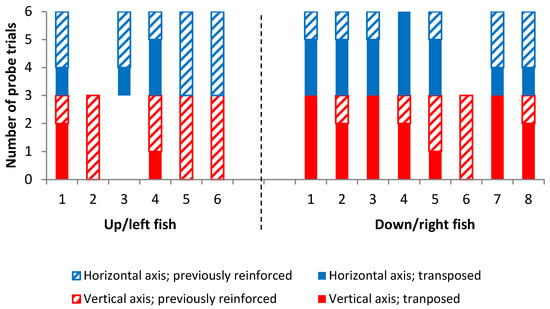 Choices of individual fish over the six probe trials. (In cases where only three trials are displayed, fish only reached the criterion and completed probe trials on one rather than both of the arrays). Note that this does not reflect the order of choices made in trials but rather the total number of each choice. The x axis shows the individual fish: 6 tested in the up/left condition and 8 in the down/right group.