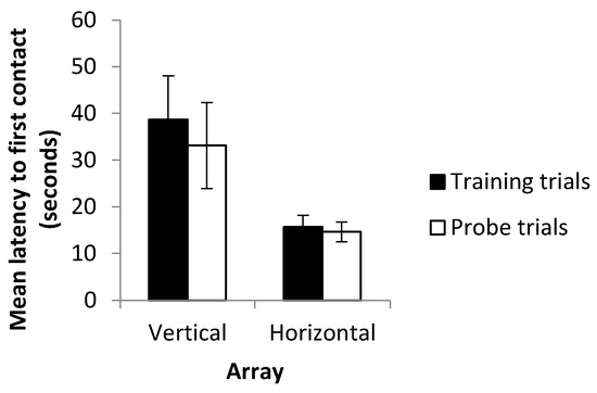 Mean Latency to first contact for probe trials and the last three training trials. Data shown separately for the vertical and horizontal arrays. Error bars denote standard error of the mean.