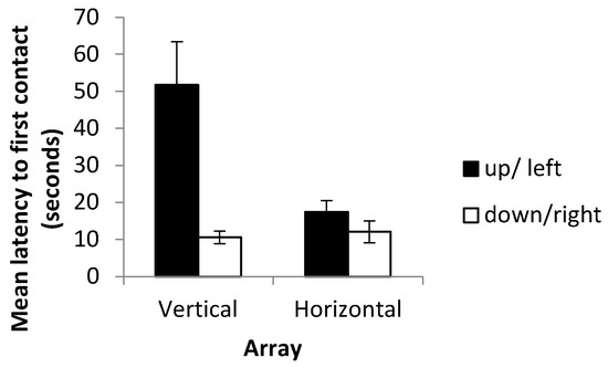 Mean latency to first contact across both the horizontal and vertical arrays showing up/left and down/right fish separately. Data include both testing and probe trials. Error bars denote the standard error of the mean.