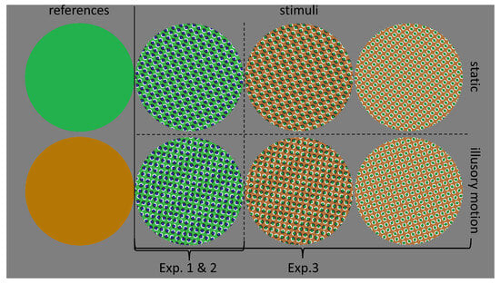 - Kitaoka, A. Color-dependent motion illusions in stationary images and their phenomenal dimorphism. Perception 2014, 43, 914–925. [Google Scholar] [CrossRef]