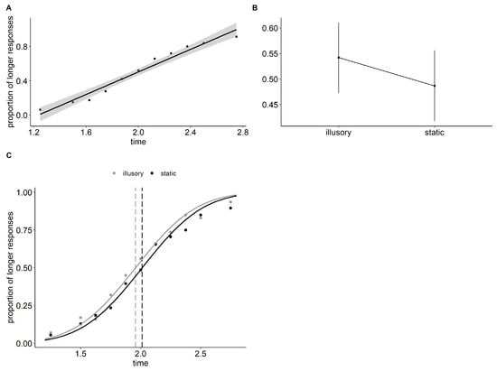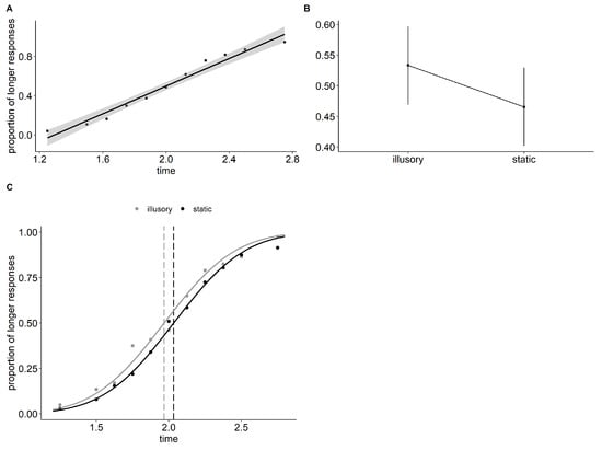 Time and type effects plots and estimated PSE for Experiment 2. (A) Proportions of “longer” responses as a function of time. Group average with linear regression and 95% confidence band. (B) GLMM estimated the proportions of “longer” responses as a function of the type of stimulus (1 illusory vs. 2 static) and texture. Bars show 95% confidence intervals. (C) Psychometric functions and PSE (Point of Subjective Equality) for the illusory and static stimuli.