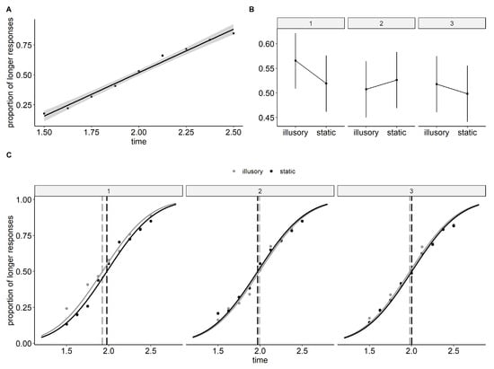 Time and type effects plots and estimated PSE for Experiment 3. (A) Proportions of “longer” responses as a function of time. Group average with linear regression and 95% confidence band. (B) GLMM estimated the proportions of “longer” responses as a function of the type of stimulus (1 illusory vs. 2 static) and texture. The pairs of textures have been ordered based on the expected strength of the illusion, with 1 representing the strong illusion, 2 representing the mild illusion, and 3 representing the weak illusion. Bars show 95% confidence intervals. (C) Psychometric functions and PSE (Point of Subjective Equality) for the three types of textures are divided into illusory and static stimuli.