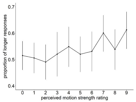 Perceived strength of illusory motion effect plot. The proportion of “longer” answers as a function of the subjective ratings of perceived motion strength. Bars show 95% confidence intervals.