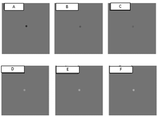 Saccadic eye movement targets presented on medium grey background (30 cd/m2). Three negative polarity contrast levels (Weber’s contrast values: (A) −0.83; (B) −0.67; (C) −0.33) and three positive polarity contrast levels (Weber’s contrast values: (D) 0.67; (E) 1.33; (F) 2.00).