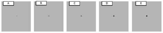 Saccadic eye movement targets on a light grey background (90 cd/m2). Five negative polarity contrast levels (Weber’s contrast values: (A) −0.22; (B) −0.44; (C) −0.67; (D) −0.89; (E) −0.94).