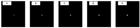 Saccadic eye movement targets on a black background (3 cd/m2). Five positive polarity contrast levels (Weber’s contrast values: (A) 2.33; (B) 9.00; (C) 15.67; (D) 22.33; (E) 29.00).