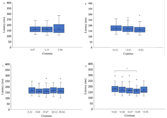 Saccadic eye movement latency as a function of stimulus contrast on three backgrounds (medium grey (positive (A) and negative (B) polarity), black (C) and light grey (D)). Data outliers, which are significantly different from the rest of the data, are marked with dots. * indicates statistically significantly different results after pairwise comparisons (post hoc analysis) with Bonferroni correction p-value < 0.05 (SPSS).