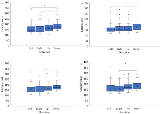 Saccadic eye movement latency as a function of stimulus direction on three backgrounds (medium grey (positive (A) and negative (B) polarity), black (C) and light grey (D)). Data outliers, which are significantly different from the rest of the data, are marked with dots. * indicates statistically significantly different results after pairwise comparisons (post hoc analysis) with Bonferroni correction p-value < 0.05 (SPSS).