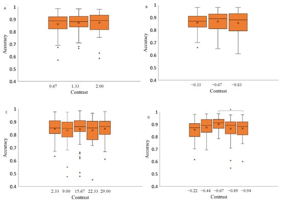 Saccadic accuracy as a function of stimulus contrast on three backgrounds (medium grey (positive (A) and negative (B) polarity), black (C) and light grey (D)). Data outliers, which are significantly different from the rest of the data, are marked with dots. * statistically indicates significantly different results after pairwise comparisons (post hoc analysis) with Bonferroni correction p-value < 0.05 (SPSS).