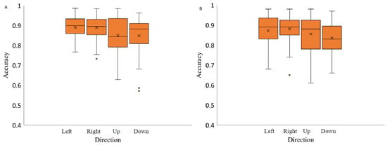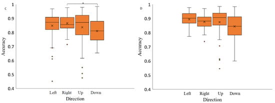 The analysis of saccadic eye movement direction effect on the saccade accuracy revealed no significant effect when the stimuli were presented on light grey background (F(1.64,23.02) = 2.80), p-value = 0.09, η2 = 0.34), and medium grey background with positive polarity (F(1.66,23.23) = 2.69, p-value = 0.10, η2 = 0.10). Two-way repeated measures ANOVA analysis indicated on a significant effect of spatial position on saccadic accuracy when the stimuli were presented on medium grey background with negative polarity (F(3,42) = 3.04, p-value = 0.04, η2 = 0.22) and a black background (F(3,42) = 3.06, p-value = 0.04, η2 = 0.27) (Figure 7). Post hoc analysis revealed significant differences in accuracy measurements only between the saccades to the right and downwards and only when the stimuli were presented on black background (Bonferroni adjusted p value, p-value < 0.05).