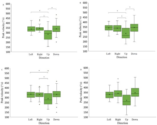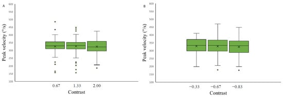 A significant spatial position effect on the peak velocity measurements was observed when the stimuli were presented on light grey background (90 cd/m2), on black background (3 cd/m2) and on medium grey background with both positive polarity and negative polarity (30 cd/m2). Similar to the results obtained by [], the current study indicates that upward saccades are characterized by a lower peak velocity measurements than saccades in other directions, which could be explained by the eye movement limitations caused by the eyelids [,]. On the other hand, unlike the results obtained by [] the current study does not demonstrate a significant difference in peak velocity measurements between right- and left-oriented saccades. This result is also inconsistent with the results obtained by [], which also demonstrated a significant difference in peak velocity between rightward and leftward saccades. The different results might be related to the fact that the current study did not separate right- and left-eye-dominant participants.