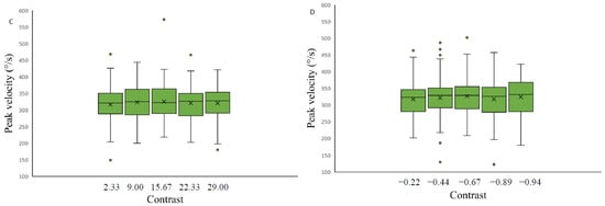 Saccadic peak velocity as a function of stimulus contrast on three backgrounds (medium grey (positive (A) and negative (B) polarity), black (C) and light grey (D)). Data outliers, which are significantly different from the rest of the data, are marked with dots.