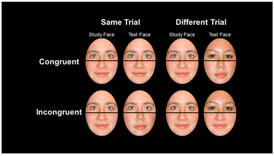 “Complete” design of study and test face combinations across congruent, incongruent, same and different trials. Faces shown are actual stimuli from the current study. All faces in this example are aligned.