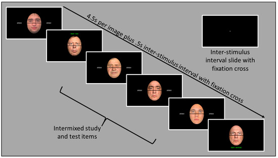 All stimuli, experimental design files, and data are available at [https://osf.io/pk3x6] (accessed on 30 July 2023). Photographic facial stimuli from two sources were used in the current study: neutral (Although some facial images might be interpreted as subtly valenced, no facial expressions were reported by their original source as overtly emotional in line with traditional moods (e.g., happy, sad, angry)) faces from the Max Plank Institute for Human Development’s FACES database [39] and neutral expression faces from the first author’s personal collection of stimuli. Images depicted adult White men and women. All faces displayed a neutral expression in frontal pose with adequate lighting and crisp resolution. Each facial image was standardized by pupil location and cropped to the same oval shape to eliminate the biasing influence of external features such as hair and face shape. Final facial images were 250 × 350 RGB color JPEG images (see Figure 1). Study faces were always displayed aligned intact, with a horizontal line crossing the bridge of the nose. Test faces were either aligned or horizontally misaligned along the nose bridge by approximately 50% (see Figure 2). In addition, test faces were recombined in one of four ways: as matching top and bottom halves from a previously studied face (i.e., Both-Old), matching top and bottom halves of a completely new face (i.e., Both-New), mismatching top and bottom halves between a previously studied face and a previously new face (i.e., Irrelevant-Old, Irrelevant-New).