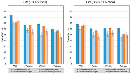 The first analysis (see Figure 4) examined hit rates in a 2 (Attention: Full vs. Divided) x 2 (Alignment: Aligned vs. Misaligned) x 2 (Face Type: Irrelevant Old vs. Irrelevant New) x 4 (Retention Interval: STM vs. Short LTM vs. Med LTM vs. Long LTM) repeated-measures ANOVA. Tests of sphericity revealed that the Retention Interval effect and the Alignment x Face Type x Retention Interval interaction violated the sphericity assumption. So, the Greenhouse-Geisser adjustment was used for the former and the Huynh-Feldt adjustment was used for the latter.