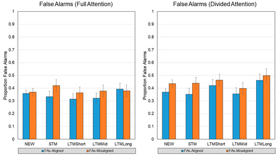 The current experiment had two types of “new” test items to contribute to false alarm calculations: faces whose irrelevant halves were also new, and faces whose irrelevant halves were old. Therefore, the latter can be examined among retention intervals, but the former has no retention interval. These five cells were combined to analyze false alarms in a single 2 (Attention) x 2 (Alignment) x 5 (Retention Interval: None, STM, Short LTM, Mid LTM, Long LTM) within-subjects ANOVA. Means are displayed in Figure 5.