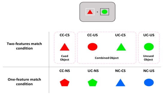 - Thayer, D.D.; Bahle, B.; Hollingworth, A. Guidance of attention from visual working memory is feature-based, not object-based: Implications for models of feature binding. J. Exp. Psychol. Gen. 2022, 151, 1018. [Google Scholar] [CrossRef]