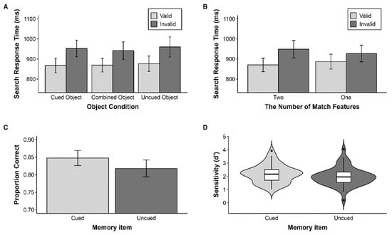 Results of Experiment 1. Error bars represent 95% confidence intervals. (A) Mean response times (RT) in the search task for Experiment 1 as a function of object condition and validity. (B) Mean RT in the search task for Experiment 1 as a function of number condition and validity. (C) Proportion of correct responses and (D) sensitivity in the memory task for Experiment 1.