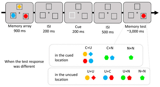 The stimuli and procedure were the same as in Experiment 1, except there were three memory items and no search task. In Experiment 2, three colored shapes and three placeholders were presented at fixed locations, equally distributed around the circle (arc length of 60° between stimuli centers). After the memory array disappeared, one of the three placeholders became bolder and flickered to guide spatial attention. Therefore, there were one cued item and two uncued items in VWM. In the memory test array, one of the items was presented, and it either retained its original color and shape (same response), or at least one of its features changed to a different feature (different response). In this study, we manipulated various cases in which the test item differed to examine the comparative effects of cued and uncued features within WM on the recognition process, in contrast to novel features not stored within WM. When a different item was presented in the cued location, either the shape or color of the item could match one of the uncued objects (Cued feature-Uncued feature; C+U), a new object (Cued feature-New feature; C+N), or both the shape and color of the item came from a new object (New feature-New feature; N+N). In the case of the uncued location, either the shape or color of the item could match another uncued item (Uncued feature at that location-Uncued feature at other location; U+U), the cued item (Uncued feature at that location-Cued feature; U+C), a new object (Uncued feature at that location-New feature; U+N), or both the shape and color could come from a new object (New feature-New feature; N+N). Other than in the N+N condition, each location in the memory test contained at least one original feature associated with that location. The experimental procedure and test conditions are illustrated in Figure 4.