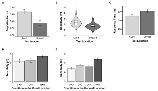 Results of Experiment 2. Error bars represent 95% confidence intervals. (A) Proportion of correct answers, (B) sensitivity, (C) mean RT in Experiment 2, (D) sensitivity in the cued location, and (E) the uncued location when the test item differed from the memory item.
