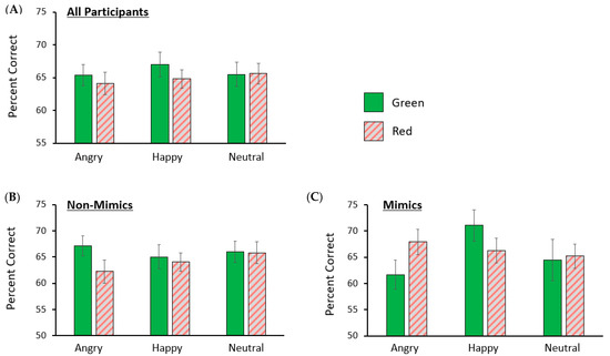 Memory accuracy for coloured shapes in Experiment 1 following the presentation of an expressive face (A) collapsed across self-selected memory strategy, among (B) non-mimickers (n = 21), and (C) mimickers (n = 10). Error bars represent the standard error of the mean.