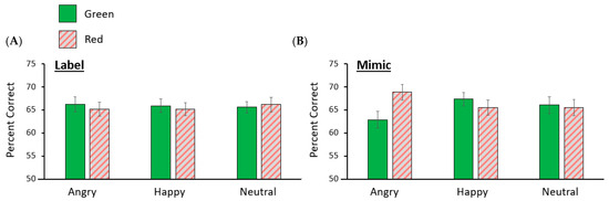 Mean memory accuracy for coloured shapes in Experiment 2 following the presentation of an expressive face among participants allocated to the (A) labelling, and (B) mimicking conditions. Error bars represent the standard error of the mean.