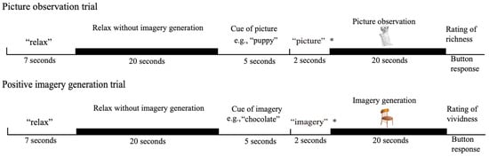 The experimental procedure: The asterisk (*) represents the cue for the participant’s task for the next 20 s. “Picture” indicates that their task was to observe the presented picture. “Imagery” indicates that their task was to generate imagery of the cue while seeing at the presented picture. The pictures presented in the picture observation and positive imagery generation conditions were, for example, a puppy and a chair.